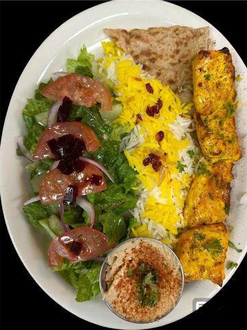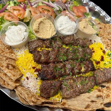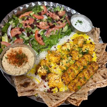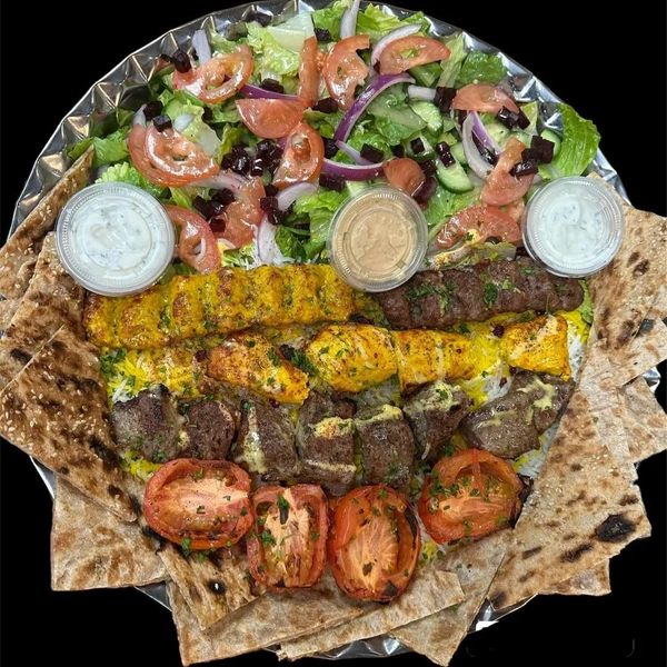 One skewer of seasoned ground beef kabob, one skewer of seasoned ground chicken kabob, one skewer of marinated chicken breast chunk kabob & five slices of gyros (thin strips of lamb), served with rice, garden salad, pita bread and a 2oz side of hummus or tzatziki