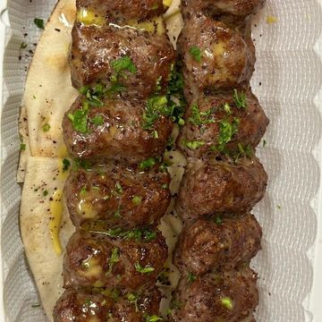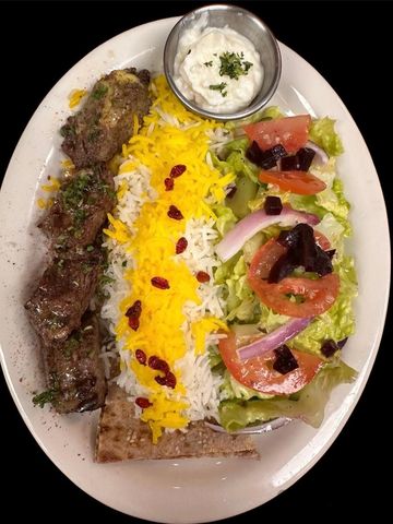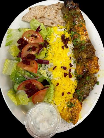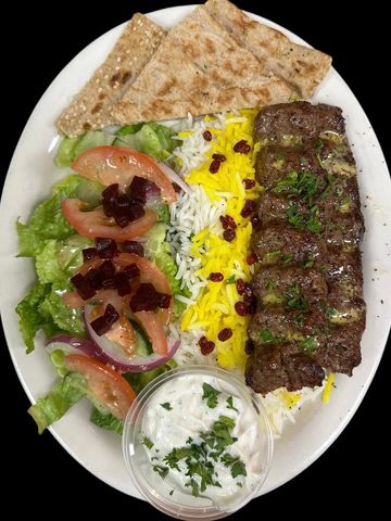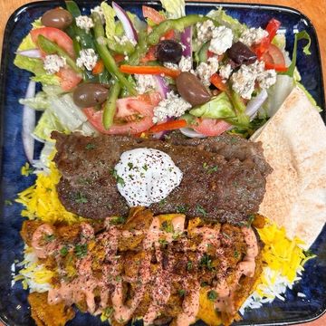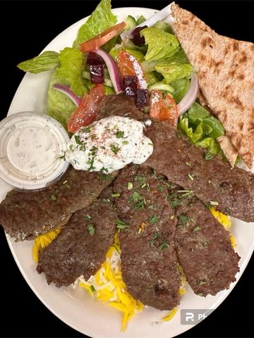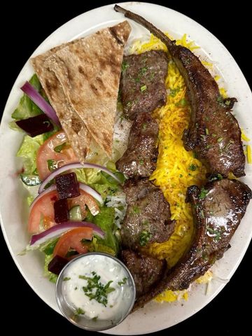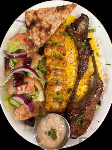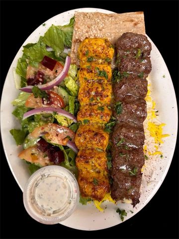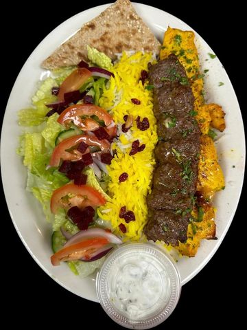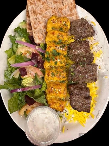 One skewer of tender and marinated filet mignon & one skewer of seasoned ground beef kabob, served with basmati rice, garden salad, pita bread, and a 2 oz side of tzatziki or hummus.