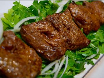 Boneless chunks of tender chicken breast filet marinated and charbroiled & one juicy skewer of seasoned ground beef lule kabob.