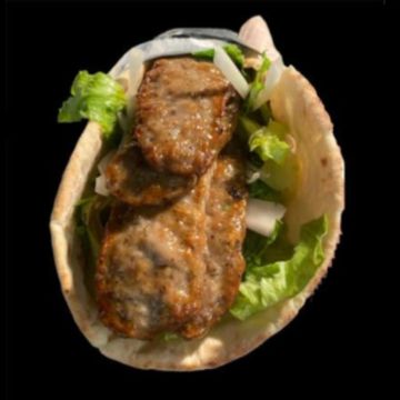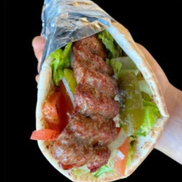 One skewer of Seasoned ground beef wrapped in pita bread with garlic sauce, lettuce, tomatoes, onion, and pickles.