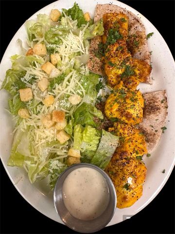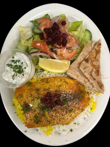 Seasoned sauteed salmon served with rice, garden salad, pita bread, and 2 oz side of tzatziki or hummus.