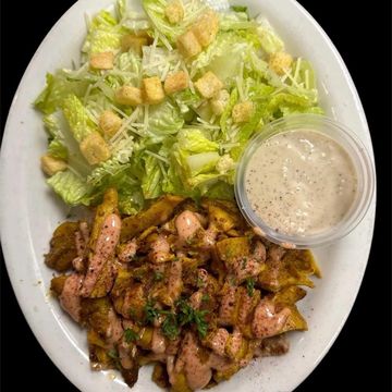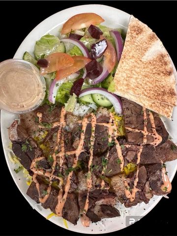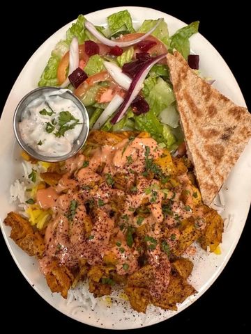 Marinated boneless chicken thigh grilled on shawarma machine, and gyro (three thin slices of lamb), served with basmati rice, garden salad, pita bread and 2 oz side of hummus or tzatziki