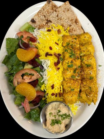 Two skewers of seasoned ground chicken kabob & two skewers of marinated and charbroiled tender chicken breast chunk kabob, served with basmati rice, garden salad, pita bread and a 2oz side of hummus or tzatziki.