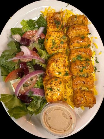 One skewer of boneless marinated filet mignon chunks and charbroiled chicken breast kabob, served with basmati rice, garden salad, pita bread, and a 2 oz side of hummus or tzatziki.