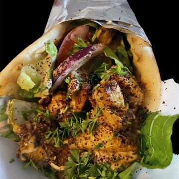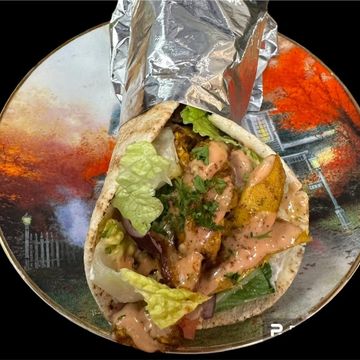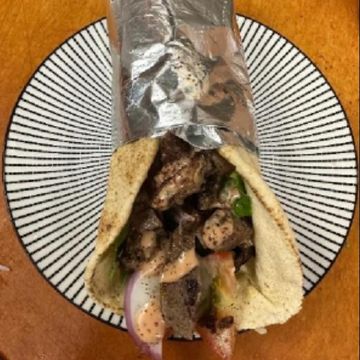 Marinated boneless chicken thigh, grilled on shawarma machine, wrapped in pita bread with garlic sauce, lettuce, tomatoes, and pickles.