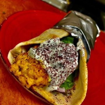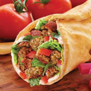 Mixture of chickpeas, fresh herbs, and spices wrapped in pita bread with garlic sauce, lettuce, onion, tomatoes, and pickles.