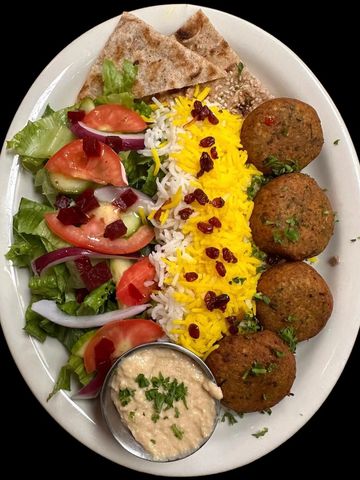 Mixture of chickpeas, fresh herbs, spices, served with rice, garden salad, pita bread, and a 2 oz side of hummus or tzatziki.