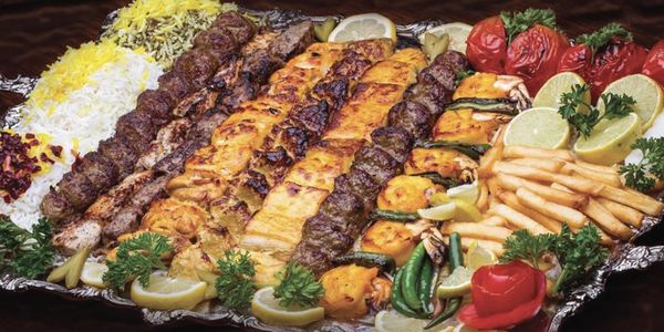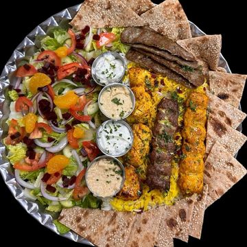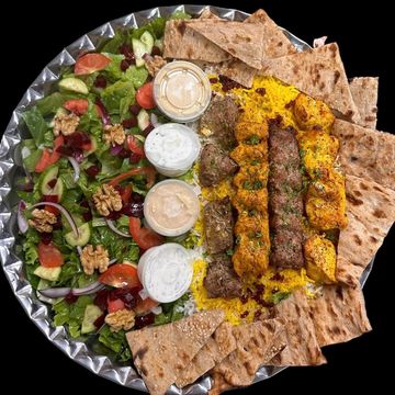 One skewer of beef shish kabob (marinated filet mignon), one skewer of beef lule kabob (seasoned ground beef), one skewer of chicken shish kabob (marinated chicken breast chunk), one skewer chicken lule kabob (seasoned ground chicken), served with rice, garden salad, pita bread and a 2oz side of hummus or tzatziki.