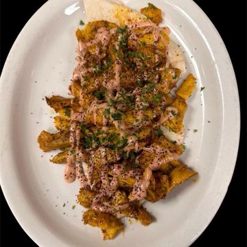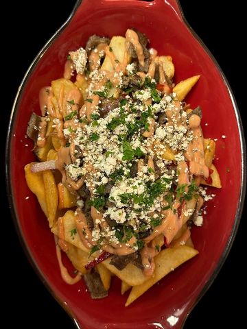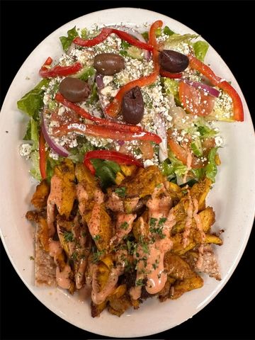 Served with gyro (thin slices of lamb), grilled bell peppers and onion, topped with feta cheese and house sauce.