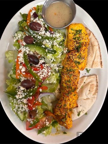One skewer of boneless chunks of tender chicken breast filet marinated and charbroiled served with basmati rice, garden salad, pita bread, and a 2 oz side of hummus or tzatziki.