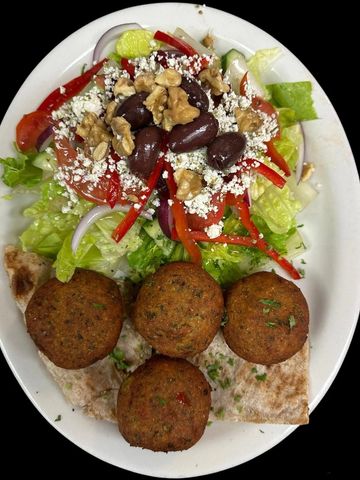 Romaine heart lettuce, bell pepper, tomato, onion, Persian cucumber, topped with feta cheese and olive, served with falafel.
