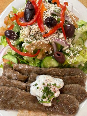 Thin slices of lamb with greek salad, served with half a pita bread.