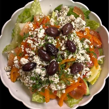 Romaine hearts, bell pepper, tomato, onion, Persian cucumber, topped with feta cheese & olives.