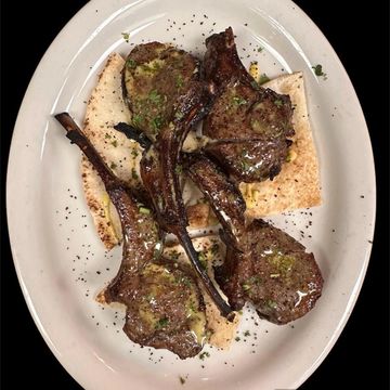 Marinated lamb chops served with basmati rice, garden salad, pita bread, and a 2 oz side of hummus or tzatziki.