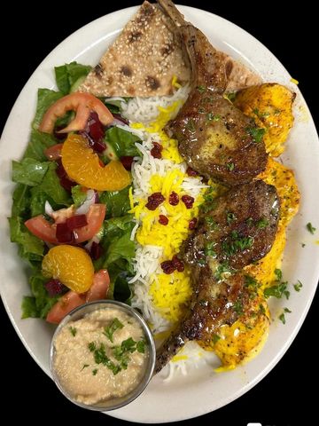 Marinated lamb chops and one skewer of tender chunks of chicken filet, served with rice, garden salad, pita bread, and a 2 oz side of hummus or tzatziki.