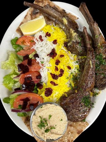 Lamb chops and one skewer of tender chunks of beef filet, served with basmati rice, garden salad, pita bread, and a 2 oz side of hummus or tzatziki.