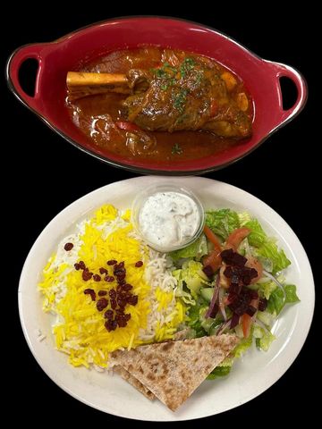 Braised lamb shank served with basmati rice, garden salad, bread, and a 2 oz side of humus or tzatziki.