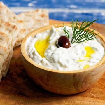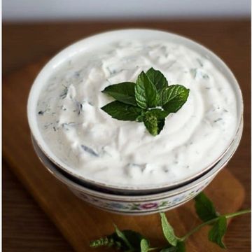 Creamy plain yogurt mixed with chopped fresh Persian cucumber and dried mint, dill seasoning.