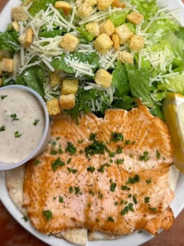 Seasoned sauteed salmon served with romaine heart lettuce parmesan cheese, croutons and Caesar Dressing.