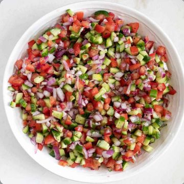 Chopped Persian cucumbers, onions, tomatoes, mixed with peppers, lemon juice and dried mint.