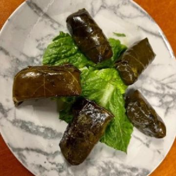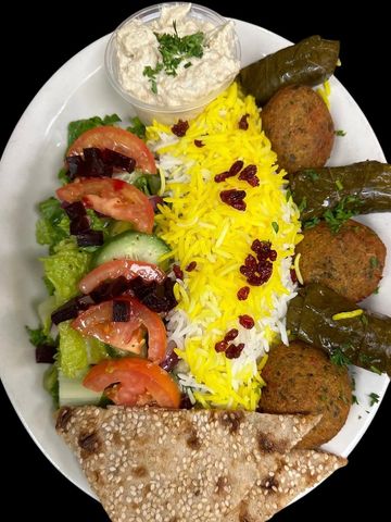 Dolmas, falafel, garden salad, and hummus/tzatziki served with rice, and pita bread.