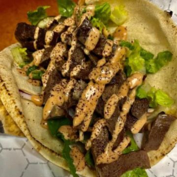Slices of tongue wrapped in pita bread with garlic sauce, lettuce, tomatoes, and pickles.