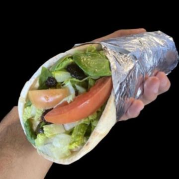Lettuce, tomatoes onions, dolma, and hummus wrapped in pita bread.